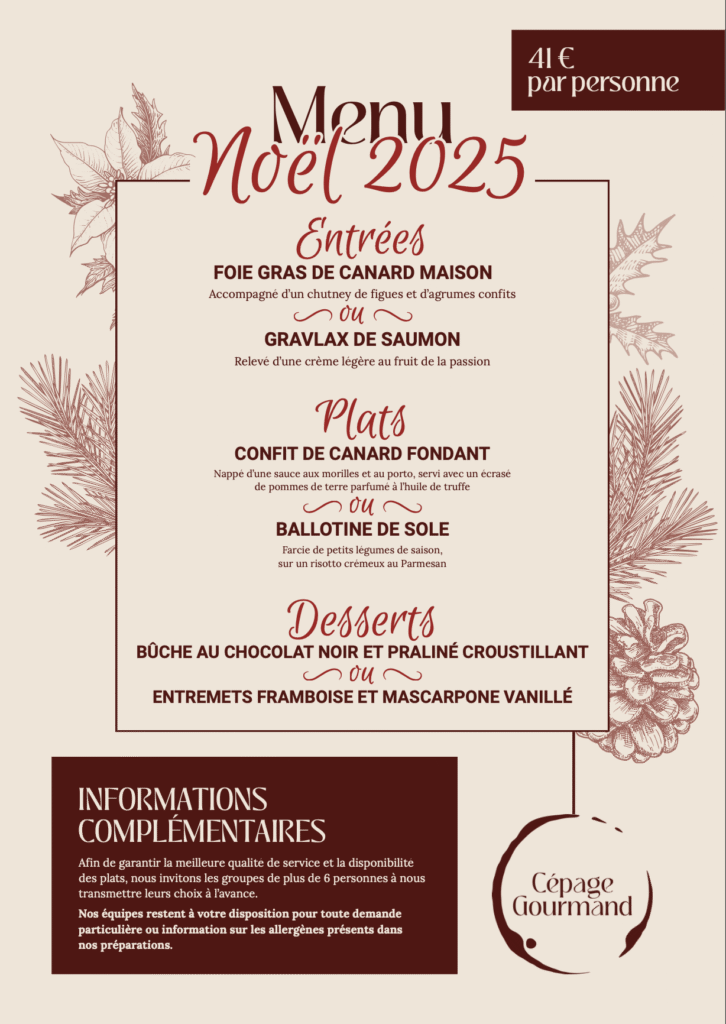 Menu du marché Menu Cépage La carte La carte des vins Menu Noël 2025 Menu du Midi du 09 au 15 décembre 23€ Entrée + Plat ou Plat + Dessert à 20€ Entrées Velouté DubarryouSalade de pommes et dattes Plats Travers de porc, butternut rôtie au miel et herbes de Provence ouFilet de Sole en chapelure aux amandes, butternut rôtie au miel et herbes de Provence Desserts CheesecakeouSalade de fruits de saison ouChoix à la carte (+4€) Menu Cépage, Midi et soir 39€ Entrée + Plat ou Plat + Dessert à 30€ Entrées Un tapas au choix à la carte Plats Filet de poisson du marchéouPâtes fraiches au pesto et auberginesouPorc caramelisé facon asiatique Desserts Dessert au choix (hors café gourmand) Menu Enfant 12€ (- de 12 ans) Plats Filet de poisson ou Steak Haché avec accompagnement du moment Dessert du moment Réserver une table Notre carte Réserver une table La carte des vins